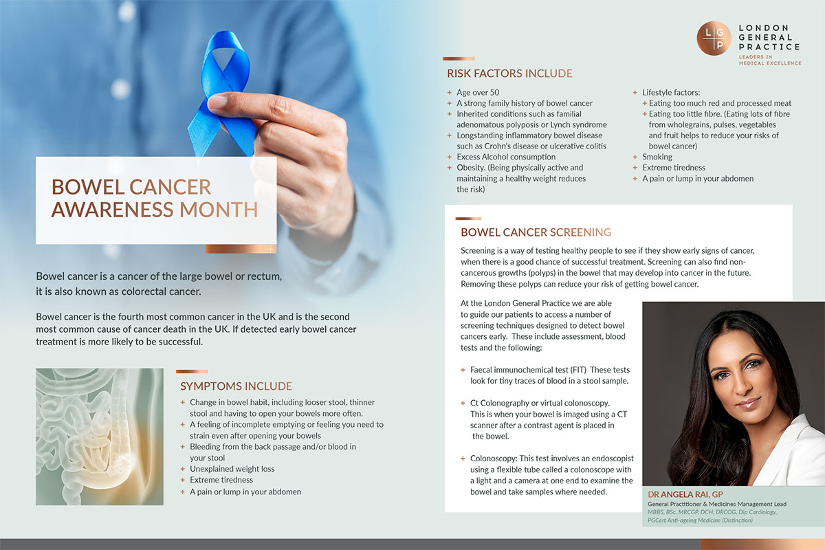 At the London General Practice we are able to guide our patients to access a number of screening techniques designed to detect bowel cancers early. These include assessment, blood tests and the following: